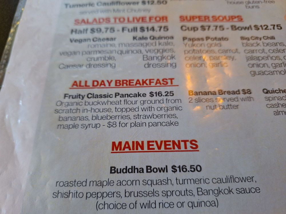Fresh greens, sprouts, choice of dressing (vegan caesar, honey mustard, peach vinaigrette, cilantro vinaigrette, bangkok dressing)